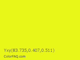 Yxy 83.735,0.407,0.511 Color is a normal yellow color and the nearest color is Piss Yellow #e1e115. Hex code #e8f717 and RGB value is rgb(232,247,23). In RGB color space, this color is composed of 91% red, 97% green, 9% blue, In CMYK color space, this color is composed of 6% cyan, 0% magenta, 91% yellow , 3% black , In HSL color space, this color has a hue angle of 64° , 93% saturation and 53% lightness.