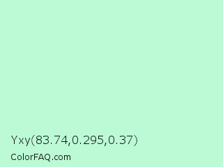 Yxy 83.74,0.295,0.37 Color is a very light green color and the nearest color is Cruise #b5ecdf. Hex code #bbfad5 and RGB value is rgb(187,250,213). In RGB color space, this color is composed of 73% red, 98% green, 84% blue, In CMYK color space, this color is composed of 25% cyan, 0% magenta, 15% yellow , 2% black , In HSL color space, this color has a hue angle of 145° , 86% saturation and 86% lightness.