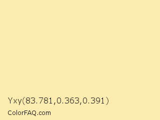 Yxy 83.781,0.363,0.391 Color is a very light yellow color and the nearest color is Banana Mania Crayola #fbe7b2. Hex code #fcecaf and RGB value is rgb(252,236,175). In RGB color space, this color is composed of 99% red, 93% green, 69% blue, In CMYK color space, this color is composed of 0% cyan, 6% magenta, 31% yellow , 1% black , In HSL color space, this color has a hue angle of 48° , 93% saturation and 84% lightness.