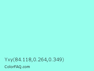Yxy 84.118,0.264,0.349 Color is a light cyan color and the nearest color is Waterspout #a4f4f9. Hex code #96ffed and RGB value is rgb(150,255,237). In RGB color space, this color is composed of 59% red, 100% green, 93% blue, In CMYK color space, this color is composed of 41% cyan, 0% magenta, 7% yellow , 0% black , In HSL color space, this color has a hue angle of 170° , 100% saturation and 79% lightness.