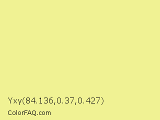 Yxy 84.136,0.37,0.427 Color is a light yellow color and the nearest color is Primrose #edea99. Hex code #f0f293 and RGB value is rgb(240,242,147). In RGB color space, this color is composed of 94% red, 95% green, 58% blue, In CMYK color space, this color is composed of 1% cyan, 0% magenta, 39% yellow , 5% black , In HSL color space, this color has a hue angle of 61° , 79% saturation and 76% lightness.