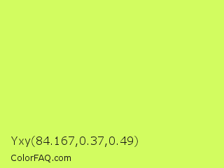 Yxy 84.167,0.37,0.49 Color is a light lime color and the nearest color is Maximum Green Yellow #d9e650. Hex code #d2fc60 and RGB value is rgb(210,252,96). In RGB color space, this color is composed of 82% red, 99% green, 38% blue, In CMYK color space, this color is composed of 17% cyan, 0% magenta, 62% yellow , 1% black , In HSL color space, this color has a hue angle of 76° , 96% saturation and 68% lightness.