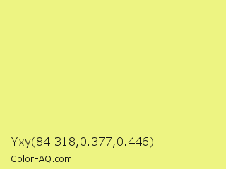 Yxy 84.318,0.377,0.446 Color is a light yellow color and the nearest color is Honeysuckle #edfc84. Hex code #edf482 and RGB value is rgb(237,244,130). In RGB color space, this color is composed of 93% red, 96% green, 51% blue, In CMYK color space, this color is composed of 3% cyan, 0% magenta, 47% yellow , 4% black , In HSL color space, this color has a hue angle of 64° , 84% saturation and 73% lightness.