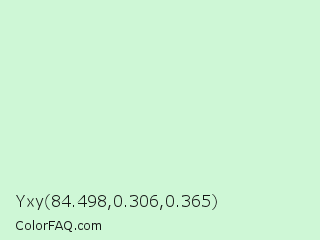 Yxy 84.498,0.306,0.365 Color is a very light green color and the nearest color is Blue Romance #d2f6de. Hex code #cef7d6 and RGB value is rgb(206,247,214). In RGB color space, this color is composed of 81% red, 97% green, 84% blue, In CMYK color space, this color is composed of 17% cyan, 0% magenta, 13% yellow , 3% black , In HSL color space, this color has a hue angle of 132° , 72% saturation and 89% lightness.