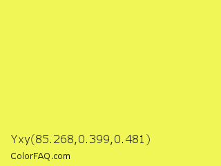 Yxy 85.268,0.399,0.481 Color is a light yellow color and the nearest color is Canary #f3fb62. Hex code #f0f655 and RGB value is rgb(240,246,85). In RGB color space, this color is composed of 94% red, 96% green, 33% blue, In CMYK color space, this color is composed of 2% cyan, 0% magenta, 65% yellow , 4% black , In HSL color space, this color has a hue angle of 62° , 90% saturation and 65% lightness.
