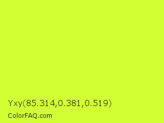 Yxy 85.314,0.381,0.519 Color is a normal lime color and the nearest color is Pear #d1e231. Hex code #d1ff34 and RGB value is rgb(209,255,52). In RGB color space, this color is composed of 82% red, 100% green, 20% blue, In CMYK color space, this color is composed of 18% cyan, 0% magenta, 80% yellow , 0% black , In HSL color space, this color has a hue angle of 74° , 100% saturation and 60% lightness.