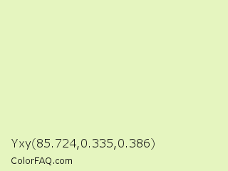 Yxy 85.724,0.335,0.386 Color is a very light lime color and the nearest color is Tusk #eef3c3. Hex code #e5f5bf and RGB value is rgb(229,245,191). In RGB color space, this color is composed of 90% red, 96% green, 75% blue, In CMYK color space, this color is composed of 7% cyan, 0% magenta, 22% yellow , 4% black , In HSL color space, this color has a hue angle of 78° , 73% saturation and 85% lightness.