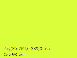 Yxy 85.762,0.389,0.51 Color is a light yellow color and the nearest color is Starship #ecf245. Hex code #dcfd39 and RGB value is rgb(220,253,57). In RGB color space, this color is composed of 86% red, 99% green, 22% blue, In CMYK color space, this color is composed of 13% cyan, 0% magenta, 77% yellow , 1% black , In HSL color space, this color has a hue angle of 70° , 98% saturation and 61% lightness.
