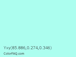 Yxy 85.886,0.274,0.346 Color is a very light cyan color and the nearest color is Ice Cold #b1f4e7. Hex code #acfeef and RGB value is rgb(172,254,239). In RGB color space, this color is composed of 67% red, 100% green, 94% blue, In CMYK color space, this color is composed of 32% cyan, 0% magenta, 6% yellow , 0% black , In HSL color space, this color has a hue angle of 169° , 98% saturation and 84% lightness.