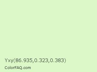 Yxy 86.935,0.323,0.383 Color is a very light green color and the nearest color is Snow Flurry #e4ffd1. Hex code #dbf9c7 and RGB value is rgb(219,249,199). In RGB color space, this color is composed of 86% red, 98% green, 78% blue, In CMYK color space, this color is composed of 12% cyan, 0% magenta, 20% yellow , 2% black , In HSL color space, this color has a hue angle of 96° , 81% saturation and 88% lightness.