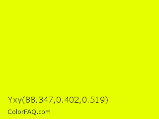 Yxy 88.347,0.402,0.519 Color is a normal yellow color and the nearest color is Lemon Lime #e3ff00. Hex code #e6ff00 and RGB value is rgb(230,255,0). In RGB color space, this color is composed of 90% red, 100% green, 0% blue, In CMYK color space, this color is composed of 10% cyan, 0% magenta, 100% yellow , 0% black , In HSL color space, this color has a hue angle of 66° , 100% saturation and 50% lightness.