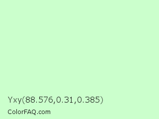 Yxy 88.576,0.31,0.385 Color is a very light green color and the nearest color is Snowy Mint #d6ffdb. Hex code #cbffcc and RGB value is rgb(203,255,204). In RGB color space, this color is composed of 80% red, 100% green, 80% blue, In CMYK color space, this color is composed of 20% cyan, 0% magenta, 20% yellow , 0% black , In HSL color space, this color has a hue angle of 121° , 100% saturation and 90% lightness.