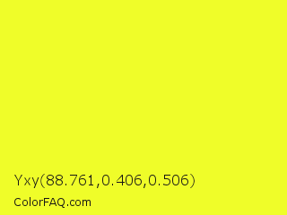 Yxy 88.761,0.406,0.506 Color is a normal yellow color and the nearest color is Daffodil #ffff31. Hex code #effd29 and RGB value is rgb(239,253,41). In RGB color space, this color is composed of 94% red, 99% green, 16% blue, In CMYK color space, this color is composed of 6% cyan, 0% magenta, 84% yellow , 1% black , In HSL color space, this color has a hue angle of 64° , 98% saturation and 58% lightness.