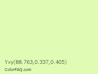 Yxy 88.763,0.337,0.405 Color is a very light green color and the nearest color is Gossip #d2f8b0. Hex code #e0fcb4 and RGB value is rgb(224,252,180). In RGB color space, this color is composed of 88% red, 99% green, 71% blue, In CMYK color space, this color is composed of 11% cyan, 0% magenta, 29% yellow , 1% black , In HSL color space, this color has a hue angle of 83° , 92% saturation and 85% lightness.