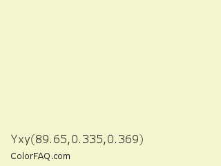 Yxy 89.65,0.335,0.369 Color is a very light yellow color and the nearest color is Corn Field #f8facd. Hex code #f4f6cf and RGB value is rgb(244,246,207). In RGB color space, this color is composed of 96% red, 96% green, 81% blue, In CMYK color space, this color is composed of 1% cyan, 0% magenta, 16% yellow , 4% black , In HSL color space, this color has a hue angle of 63° , 68% saturation and 89% lightness.