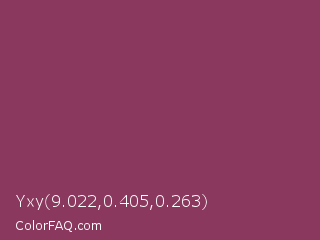 Yxy 9.022,0.405,0.263 Color is a normal rose color and the nearest color is Quinacridone Magenta #8e3a59. Hex code #8a385d and RGB value is rgb(138,56,93). In RGB color space, this color is composed of 54% red, 22% green, 36% blue, In CMYK color space, this color is composed of 0% cyan, 59% magenta, 33% yellow , 46% black , In HSL color space, this color has a hue angle of 333° , 42% saturation and 38% lightness.
