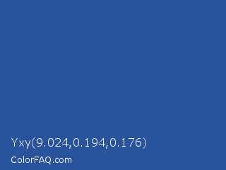 Yxy 9.024,0.194,0.176 Color is a normal blue color and the nearest color is St Tropaz #2d569b. Hex code #29539b and RGB value is rgb(41,83,155). In RGB color space, this color is composed of 16% red, 33% green, 61% blue, In CMYK color space, this color is composed of 74% cyan, 46% magenta, 0% yellow , 39% black , In HSL color space, this color has a hue angle of 218° , 58% saturation and 38% lightness.