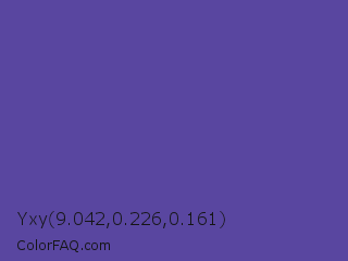 Yxy 9.042,0.226,0.161 Color is a normal indigo color and the nearest color is Butterfly Bush #624e9a. Hex code #5946a0 and RGB value is rgb(89,70,160). In RGB color space, this color is composed of 35% red, 27% green, 63% blue, In CMYK color space, this color is composed of 44% cyan, 56% magenta, 0% yellow , 37% black , In HSL color space, this color has a hue angle of 253° , 39% saturation and 45% lightness.