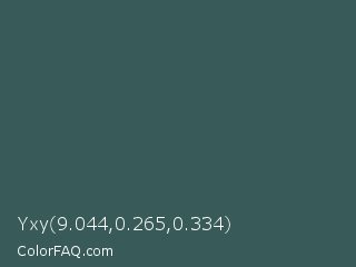 Yxy 9.044,0.265,0.334 Color is a dark cyan color and the nearest color is Spectra #2f5a57. Hex code #385b59 and RGB value is rgb(56,91,89). In RGB color space, this color is composed of 22% red, 36% green, 35% blue, In CMYK color space, this color is composed of 38% cyan, 0% magenta, 2% yellow , 64% black , In HSL color space, this color has a hue angle of 177° , 24% saturation and 29% lightness.