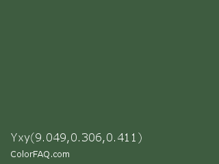 Yxy 9.049,0.306,0.411 Color is a dark green color and the nearest color is Tom Thumb #3f583b. Hex code #3e5c40 and RGB value is rgb(62,92,64). In RGB color space, this color is composed of 24% red, 36% green, 25% blue, In CMYK color space, this color is composed of 33% cyan, 0% magenta, 30% yellow , 64% black , In HSL color space, this color has a hue angle of 124° , 19% saturation and 30% lightness.