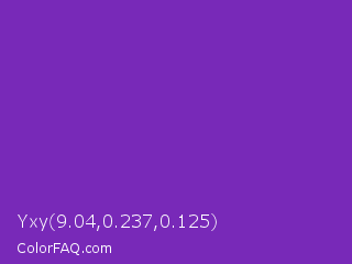 Yxy 9.04,0.237,0.125 Color is a normal purple color and the nearest color is Grape #6f2da8. Hex code #7829b8 and RGB value is rgb(120,41,184). In RGB color space, this color is composed of 47% red, 16% green, 72% blue, In CMYK color space, this color is composed of 35% cyan, 78% magenta, 0% yellow , 28% black , In HSL color space, this color has a hue angle of 273° , 64% saturation and 44% lightness.