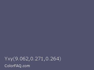 Yxy 9.062,0.271,0.264 Color is a normal blue color and the nearest color is Independence #4c516d. Hex code #51536e and RGB value is rgb(81,83,110). In RGB color space, this color is composed of 32% red, 33% green, 43% blue, In CMYK color space, this color is composed of 26% cyan, 25% magenta, 0% yellow , 57% black , In HSL color space, this color has a hue angle of 236° , 15% saturation and 37% lightness.