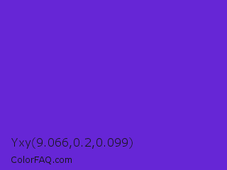 Yxy 9.066,0.2,0.099 Color is a normal violet color and the nearest color is Purple Heart Crayola #652dc1. Hex code #6626d6 and RGB value is rgb(102,38,214). In RGB color space, this color is composed of 40% red, 15% green, 84% blue, In CMYK color space, this color is composed of 52% cyan, 82% magenta, 0% yellow , 16% black , In HSL color space, this color has a hue angle of 262° , 70% saturation and 49% lightness.
