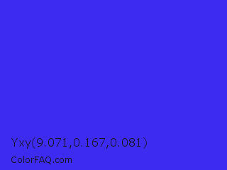 Yxy 9.071,0.167,0.081 Color is a normal indigo color and the nearest color is Han Purple #5218fa. Hex code #3d2bf1 and RGB value is rgb(61,43,241). In RGB color space, this color is composed of 24% red, 17% green, 95% blue, In CMYK color space, this color is composed of 75% cyan, 82% magenta, 0% yellow , 5% black , In HSL color space, this color has a hue angle of 245° , 88% saturation and 56% lightness.