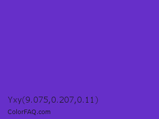Yxy 9.075,0.207,0.11 Color is a normal violet color and the nearest color is Purple Heart Crayola #652dc1. Hex code #662fc9 and RGB value is rgb(102,47,201). In RGB color space, this color is composed of 40% red, 18% green, 79% blue, In CMYK color space, this color is composed of 49% cyan, 77% magenta, 0% yellow , 21% black , In HSL color space, this color has a hue angle of 261° , 62% saturation and 49% lightness.