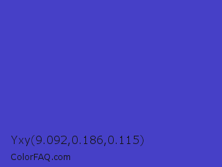 Yxy 9.092,0.186,0.115 Color is a normal indigo color and the nearest color is Ocean Blue #4f42b5. Hex code #4640c7 and RGB value is rgb(70,64,199). In RGB color space, this color is composed of 27% red, 25% green, 78% blue, In CMYK color space, this color is composed of 65% cyan, 68% magenta, 0% yellow , 22% black , In HSL color space, this color has a hue angle of 243° , 55% saturation and 52% lightness.