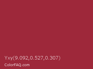 Yxy 9.092,0.527,0.307 Color is a normal red color and the nearest color is Japanese Carmine #9d2933. Hex code #9e283a and RGB value is rgb(158,40,58). In RGB color space, this color is composed of 62% red, 16% green, 23% blue, In CMYK color space, this color is composed of 0% cyan, 75% magenta, 63% yellow , 38% black , In HSL color space, this color has a hue angle of 351° , 60% saturation and 39% lightness.