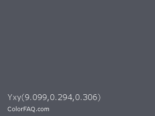 Yxy 9.099,0.294,0.306 Color is a normal blue color and the nearest color is Scarpa Flow #585562. Hex code #52555e and RGB value is rgb(82,85,94). In RGB color space, this color is composed of 32% red, 33% green, 37% blue, In CMYK color space, this color is composed of 13% cyan, 10% magenta, 0% yellow , 63% black , In HSL color space, this color has a hue angle of 225° , 7% saturation and 35% lightness.