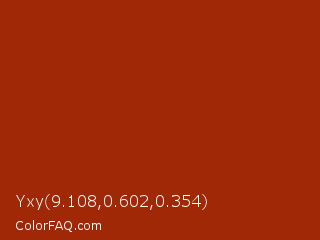 Yxy 9.108,0.602,0.354 Color is a normal red color and the nearest color is Tabasco #a02712. Hex code #a12807 and RGB value is rgb(161,40,7). In RGB color space, this color is composed of 63% red, 16% green, 3% blue, In CMYK color space, this color is composed of 0% cyan, 75% magenta, 96% yellow , 37% black , In HSL color space, this color has a hue angle of 13° , 92% saturation and 33% lightness.