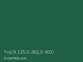 Yxy 9.125,0.262,0.403 Color is a dark green color and the nearest color is Green Pea #1d6142. Hex code #206048 and RGB value is rgb(32,96,72). In RGB color space, this color is composed of 13% red, 38% green, 28% blue, In CMYK color space, this color is composed of 67% cyan, 0% magenta, 25% yellow , 62% black , In HSL color space, this color has a hue angle of 158° , 50% saturation and 25% lightness.