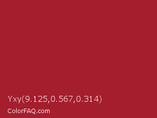 Yxy 9.125,0.567,0.314 Color is a normal red color and the nearest color is Vivid Burgundy #9f1d35. Hex code #a51e2e and RGB value is rgb(165,30,46). In RGB color space, this color is composed of 65% red, 12% green, 18% blue, In CMYK color space, this color is composed of 0% cyan, 82% magenta, 72% yellow , 35% black , In HSL color space, this color has a hue angle of 353° , 69% saturation and 38% lightness.