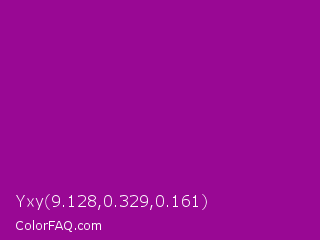 Yxy 9.128,0.329,0.161 Color is a normal magenta color and the nearest color is Violet Eggplant #991199. Hex code #990894 and RGB value is rgb(153,8,148). In RGB color space, this color is composed of 60% red, 3% green, 58% blue, In CMYK color space, this color is composed of 0% cyan, 95% magenta, 3% yellow , 40% black , In HSL color space, this color has a hue angle of 302° , 90% saturation and 32% lightness.