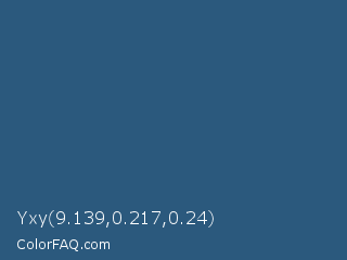 Yxy 9.139,0.217,0.24 Color is a normal blue color and the nearest color is Blumine #18587a. Hex code #2b597d and RGB value is rgb(43,89,125). In RGB color space, this color is composed of 17% red, 35% green, 49% blue, In CMYK color space, this color is composed of 66% cyan, 29% magenta, 0% yellow , 51% black , In HSL color space, this color has a hue angle of 206° , 49% saturation and 33% lightness.