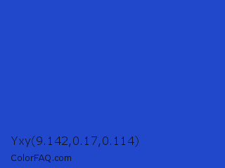 Yxy 9.142,0.17,0.114 Color is a normal blue color and the nearest color is New Car #214fc6. Hex code #2147cb and RGB value is rgb(33,71,203). In RGB color space, this color is composed of 13% red, 28% green, 80% blue, In CMYK color space, this color is composed of 84% cyan, 65% magenta, 0% yellow , 20% black , In HSL color space, this color has a hue angle of 227° , 72% saturation and 46% lightness.