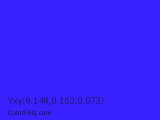Yxy 9.148,0.162,0.073 Color is a normal indigo color and the nearest color is Han Purple #5218fa. Hex code #3820ff and RGB value is rgb(56,32,255). In RGB color space, this color is composed of 22% red, 13% green, 100% blue, In CMYK color space, this color is composed of 78% cyan, 87% magenta, 0% yellow , 0% black , In HSL color space, this color has a hue angle of 246° , 100% saturation and 56% lightness.