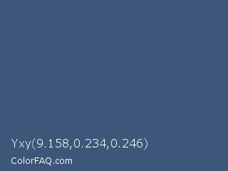 Yxy 9.158,0.234,0.246 Color is a normal blue color and the nearest color is East Bay #414c7d. Hex code #3c5779 and RGB value is rgb(60,87,121). In RGB color space, this color is composed of 24% red, 34% green, 47% blue, In CMYK color space, this color is composed of 50% cyan, 28% magenta, 0% yellow , 53% black , In HSL color space, this color has a hue angle of 213° , 34% saturation and 35% lightness.