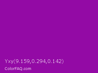 Yxy 9.159,0.294,0.142 Color is a normal magenta color and the nearest color is Violet Eggplant #991199. Hex code #930aa5 and RGB value is rgb(147,10,165). In RGB color space, this color is composed of 58% red, 4% green, 65% blue, In CMYK color space, this color is composed of 11% cyan, 94% magenta, 0% yellow , 35% black , In HSL color space, this color has a hue angle of 293° , 89% saturation and 34% lightness.