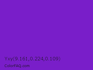 Yxy 9.161,0.224,0.109 Color is a normal purple color and the nearest color is Purple Heart Crayola #652dc1. Hex code #791ec9 and RGB value is rgb(121,30,201). In RGB color space, this color is composed of 47% red, 12% green, 79% blue, In CMYK color space, this color is composed of 40% cyan, 85% magenta, 0% yellow , 21% black , In HSL color space, this color has a hue angle of 272° , 74% saturation and 45% lightness.