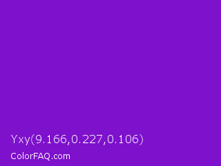 Yxy 9.166,0.227,0.106 Color is a normal purple color and the nearest color is French Violet #8806ce. Hex code #7e11cc and RGB value is rgb(126,17,204). In RGB color space, this color is composed of 49% red, 7% green, 80% blue, In CMYK color space, this color is composed of 38% cyan, 92% magenta, 0% yellow , 20% black , In HSL color space, this color has a hue angle of 275° , 85% saturation and 43% lightness.
