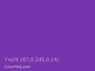 Yxy 9.167,0.245,0.14 Color is a normal purple color and the nearest color is Grape #6f2da8. Hex code #7533ad and RGB value is rgb(117,51,173). In RGB color space, this color is composed of 46% red, 20% green, 68% blue, In CMYK color space, this color is composed of 32% cyan, 71% magenta, 0% yellow , 32% black , In HSL color space, this color has a hue angle of 272° , 54% saturation and 44% lightness.