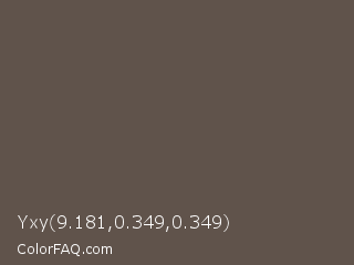 Yxy 9.181,0.349,0.349 Color is a normal orange color and the nearest color is Umber #635147. Hex code #60534b and RGB value is rgb(96,83,75). In RGB color space, this color is composed of 38% red, 33% green, 29% blue, In CMYK color space, this color is composed of 0% cyan, 14% magenta, 22% yellow , 62% black , In HSL color space, this color has a hue angle of 23° , 12% saturation and 34% lightness.