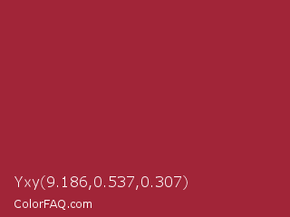 Yxy 9.186,0.537,0.307 Color is a normal red color and the nearest color is Japanese Carmine #9d2933. Hex code #a12538 and RGB value is rgb(161,37,56). In RGB color space, this color is composed of 63% red, 15% green, 22% blue, In CMYK color space, this color is composed of 0% cyan, 77% magenta, 65% yellow , 37% black , In HSL color space, this color has a hue angle of 351° , 63% saturation and 39% lightness.