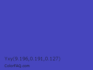 Yxy 9.196,0.191,0.127 Color is a normal indigo color and the nearest color is Ocean Blue #4f42b5. Hex code #4645bd and RGB value is rgb(70,69,189). In RGB color space, this color is composed of 27% red, 27% green, 74% blue, In CMYK color space, this color is composed of 63% cyan, 63% magenta, 0% yellow , 26% black , In HSL color space, this color has a hue angle of 241° , 48% saturation and 51% lightness.