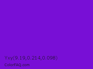 Yxy 9.19,0.214,0.098 Color is a normal purple color and the nearest color is French Violet #8806ce. Hex code #780fd6 and RGB value is rgb(120,15,214). In RGB color space, this color is composed of 47% red, 6% green, 84% blue, In CMYK color space, this color is composed of 44% cyan, 93% magenta, 0% yellow , 16% black , In HSL color space, this color has a hue angle of 272° , 87% saturation and 45% lightness.