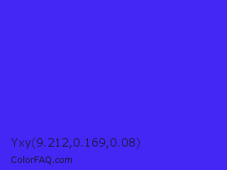 Yxy 9.212,0.169,0.08 Color is a normal indigo color and the nearest color is Han Purple #5218fa. Hex code #4427f4 and RGB value is rgb(68,39,244). In RGB color space, this color is composed of 27% red, 15% green, 96% blue, In CMYK color space, this color is composed of 72% cyan, 84% magenta, 0% yellow , 4% black , In HSL color space, this color has a hue angle of 248° , 90% saturation and 55% lightness.