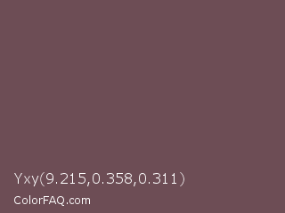 Yxy 9.215,0.358,0.311 Color is a normal red color and the nearest color is Ferra #704f50. Hex code #6d4d55 and RGB value is rgb(109,77,85). In RGB color space, this color is composed of 43% red, 30% green, 33% blue, In CMYK color space, this color is composed of 0% cyan, 29% magenta, 22% yellow , 57% black , In HSL color space, this color has a hue angle of 345° , 17% saturation and 36% lightness.